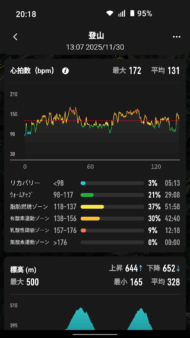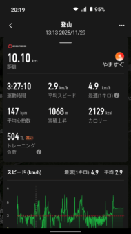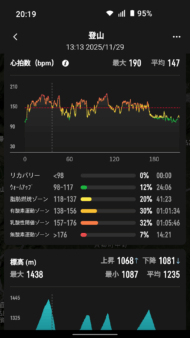 ペース的には、1個目の山の時点で「心拍数が190」近くなってしまってるので、この反動が後半にきましたね。心拍数上げるのはいいけど、諸刃の剣で後半失速してしまう。